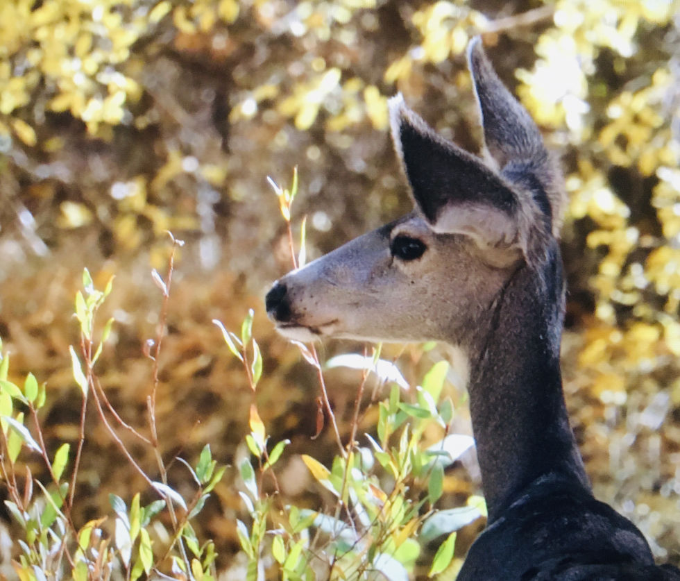 I’m up for a morning walk among the juniper trees, the dry cool air suddenly warmed by a rising breeze as the edge of Frijoles Canyon gathers and reflects the sun’s heat. My tennis shoes are scuffing up dust into the yellow, gray, and green ankle-high brush the mule deer and elk eat like candy. All I get is stickers.