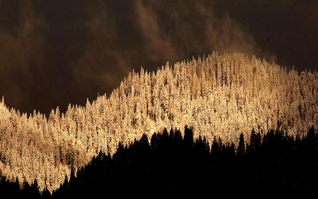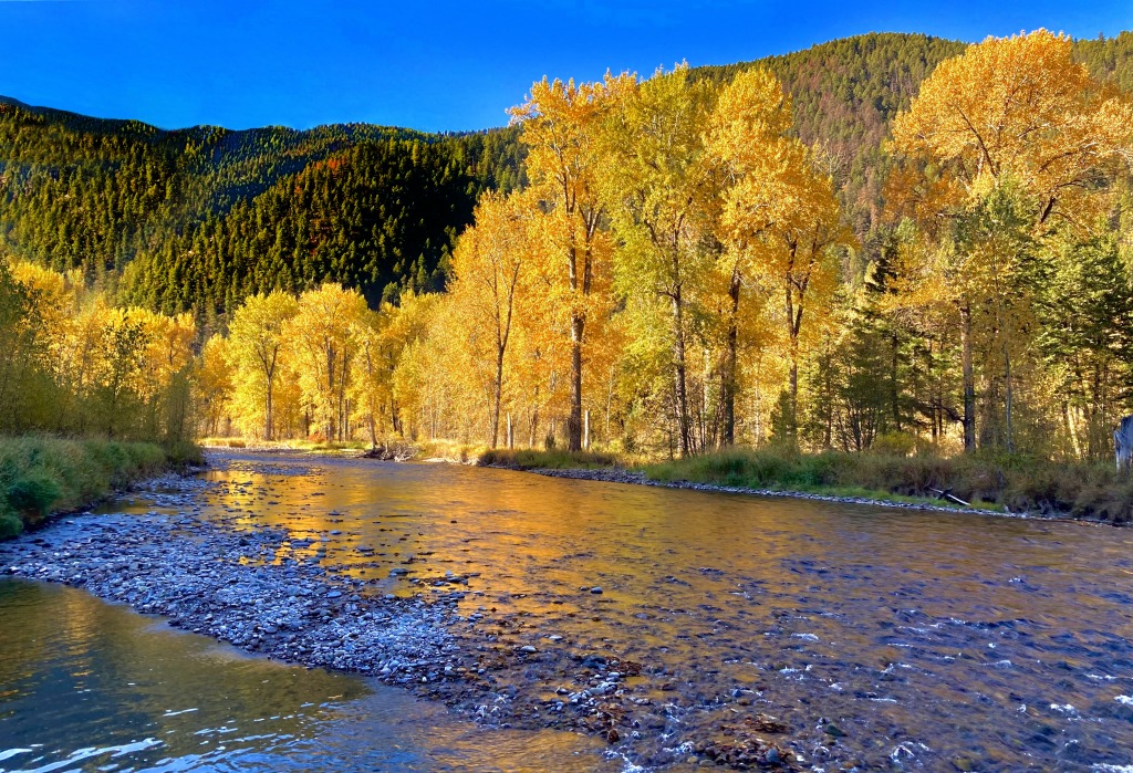 The Blackfoot River pushes gently against my legs, impatient for the sea. There are only two colors in the world—gold and blue. Cerulean describes the sky but I’ve found no word worthy of the gold of aspen, cottonwood, and tamarack. The passing water whispers and murmurs . . .